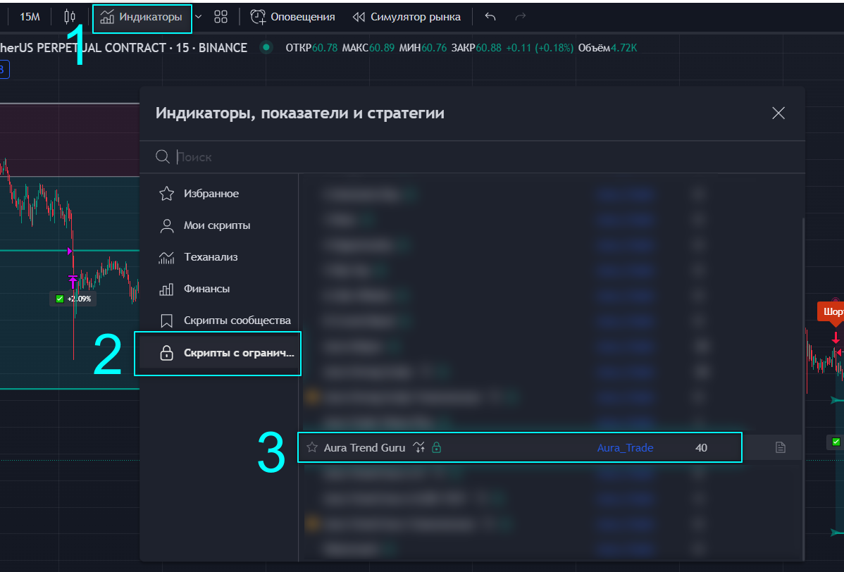 Индикаторы Trend Guru и Strong Scalp работают только на парах биржи Binance, как должна выглядеть пара видно на скриншоте