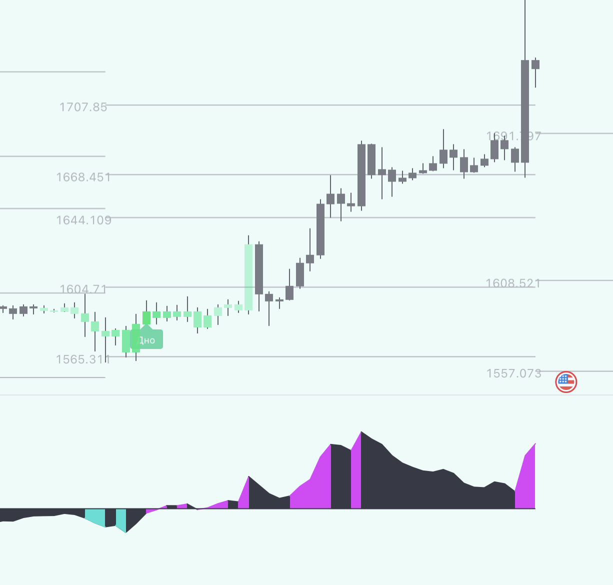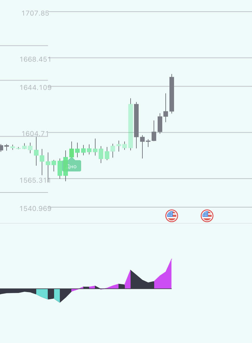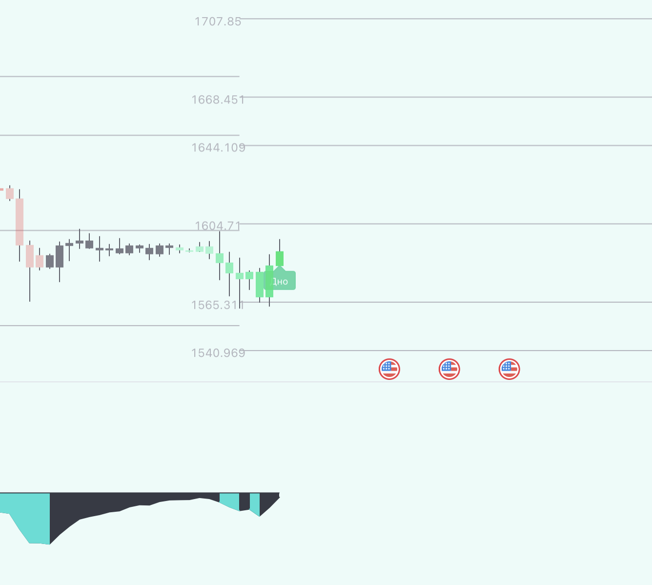 Nearby дал сигнал в лонг, доп. подтверждение - Like Whales отобразил покупки крупных игроков. Здесь мы открываем лонг. Определимся еще с целями: индикатор Smart Levels отображает уровни поддержки и сопротивления, установим тейк профиты по 1/3 объема позиции на уровнях 1644, 1668, 1707 (1604 пропускаем, потому что находится слишком близко к входу), стоп лосс установим за уровнем поддержки 1540 на цене 1530.